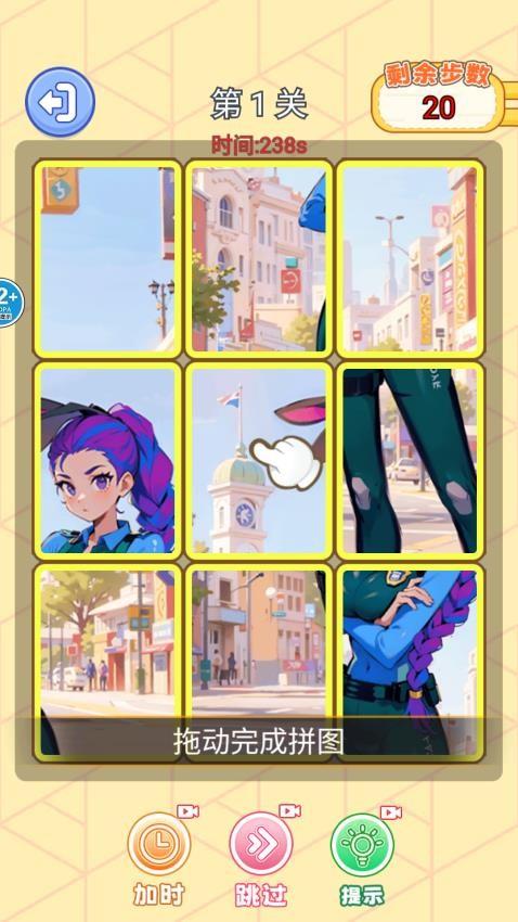 1、点击拖动适合的拼图碎片,移动到更加适合的位置上,得到正确且完整的图片便可过关。