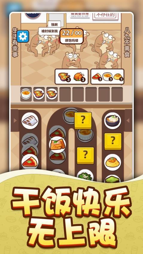 吗喽要干饭是一款相当好玩的休闲消除闯关游戏。在这款游戏中,你将会发现不同的挑战关卡,需在其中关注各个猴子的美食需求,尽快满足它们才能获得一定好处。点击相关的食物即可移动到桌面上,从中挑选适合的食物便可送到顾客手中,不能让卡槽填满,这样即可确保自己能够得到更好的挑战机会,继而可收获绝佳的消除优势。在这里将会出现许多口味不同食物,比如烤鸭、披萨、面包、蛋糕等等,它们分别摆放在不同的位置上,必须尽快挑选有利的点击方式,才能得到最好的闯关机会。如果你也对这款游戏感兴趣的话,快来试玩吧!
