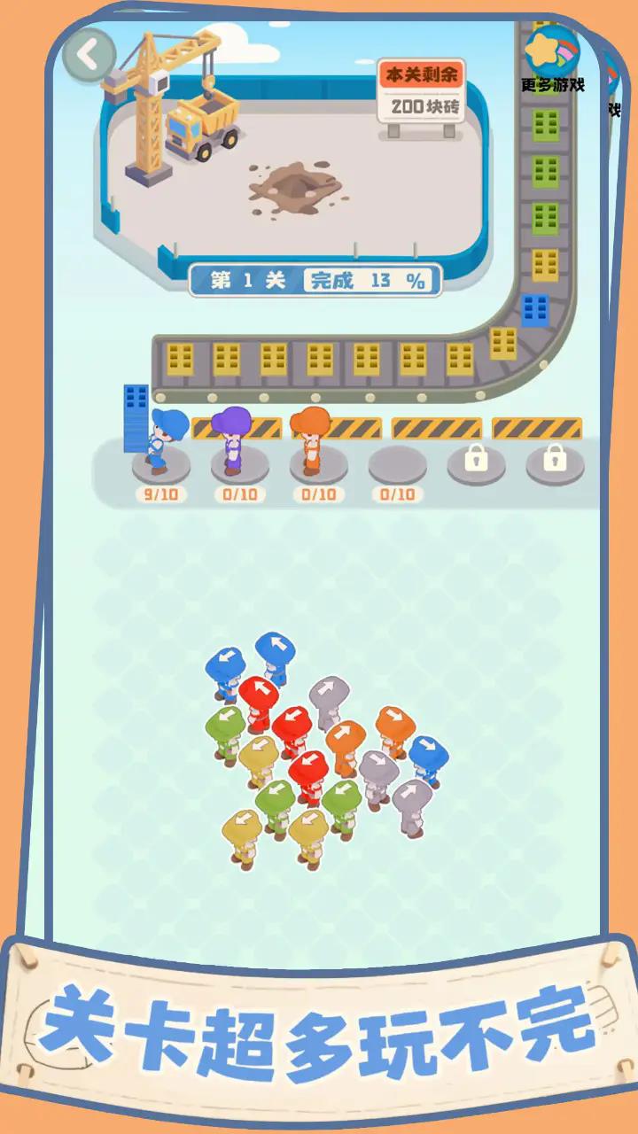 这是一款指挥工人按顺序搬砖盖房子的益智游戏,游戏中玩家扮演指挥者,根据需要的砖块颜色合理的分配工人,顺利的搬起砖块,让他们盖起一座小城市吧。