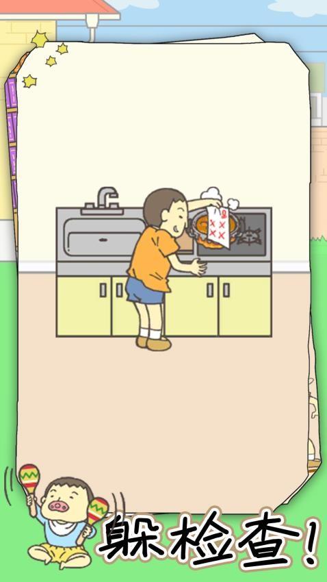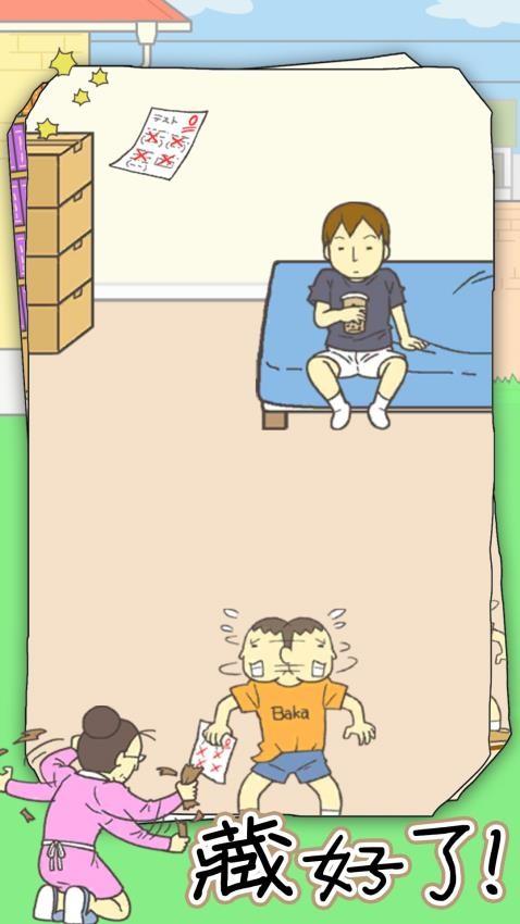玩家在客厅、花园、浴室等家庭场景中,通过点击收集物品(如家具、电器、植物等),利用这些物品遮挡试卷或布置陷阱。若成功隐藏试卷且未被“妈妈”发现,即可通关。