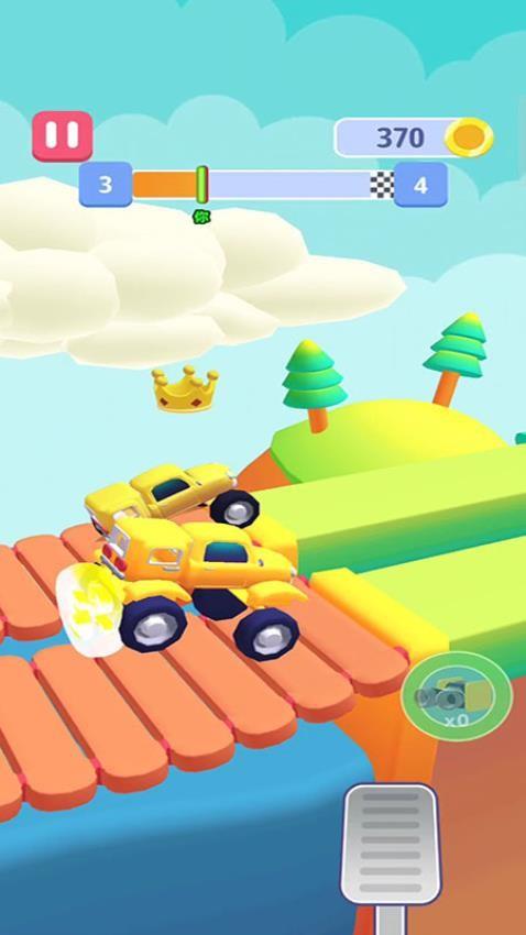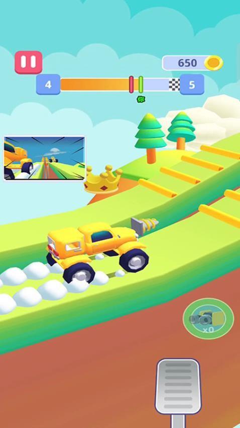 2、选赛道进入,赛车自动前行或手动操控,躲避障碍飞越坡地,按完成时间评级,解锁新零件赛道。