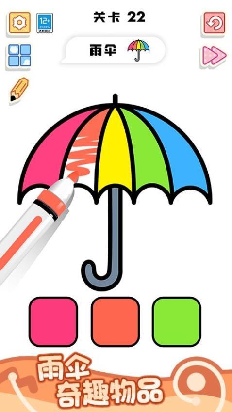2、提供第22关界面,可以在游戏绘制一个新的雨伞,直接为雨伞添加不同的颜色。