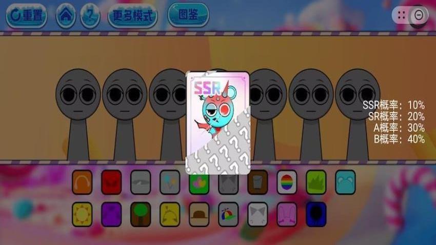 SSR概率:10%、SR概率:20%、A概率:30%、B概率:40%,可以在游戏随机获取不同品级的卡牌。