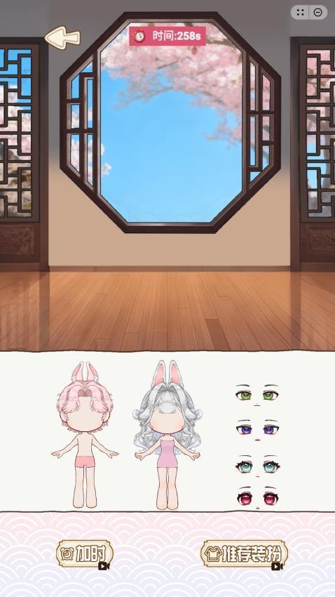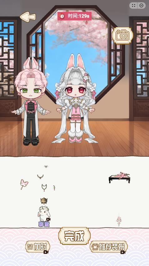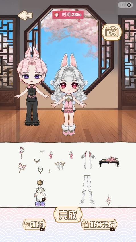 《贴纸捏捏乐》是一款国风萌系双人装扮游戏,以樱花庭院的中式场景为背景,支持同时定制两个带兔耳元素的Q版角色:你可以从五官、发型开始搭配,再选择古风服饰、饰品,甚至能添加玉兔摆件、花桌等场景装饰;游戏设有倒计时机制,还能通过“推荐装扮”快速完成造型,最终可用相机功能保存充满国风韵味的双人形象,轻松打造雅致又可爱的古风装扮组合。