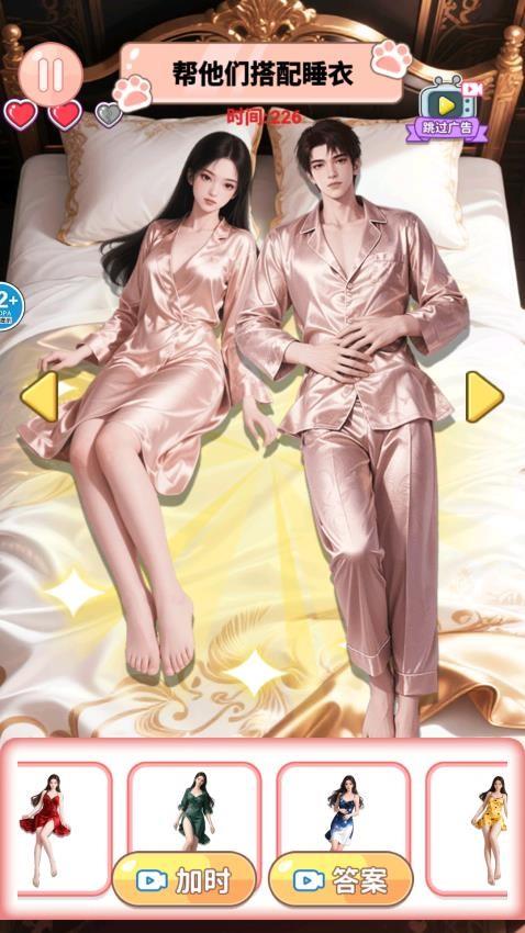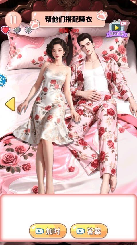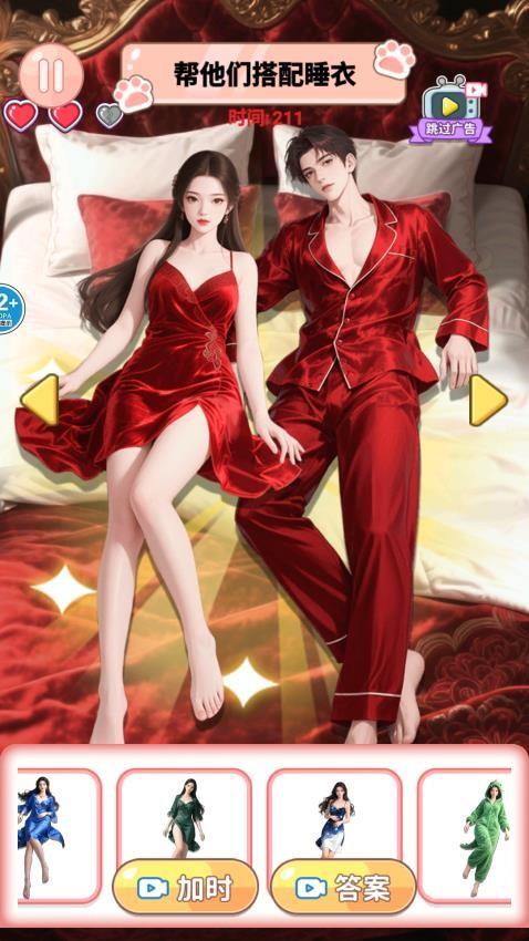 帮她约会成功手游免费版提供很多服装搭配玩法,界面提供几十种游戏类型,进入相关的关卡就可以体验不同的玩法,例如可以选择情侣睡衣玩法,游戏提供一个男性角色,提供一个女性角色,您需要找到相同的睡衣搭配才能挑战成功,一个关卡需要搭配多种睡衣,将画面显示的角色全部搭配相同的睡衣就可以通过关卡,也支持古风类型的换装游戏,官方提供很多古风的女性角色,您可以为角色添加新的花钗装饰,可以为角色添加簪花饰品,认真查找角色的服装和造型,根据服装颜色和造型搭配正确的簪花就可以挑战成功。