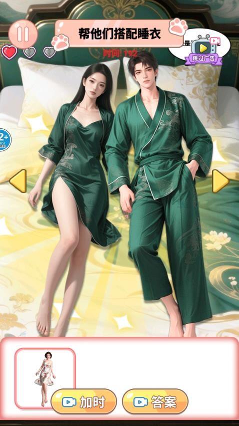 在底部区域滑动屏幕显示不同的睡衣类型,根据男性角色的睡衣为女性角色搭配相同款式的睡衣。