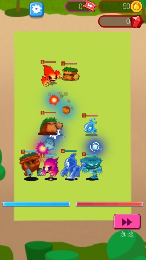 玩家通过触屏点击与拖拽操作,收集火、水、土、气四系基础怪物单位,将两个及以上同等级或同类型的怪物进行合并以解锁更高等级、属性更强的进化形态,跨元素合并还能创造出拥有特殊技能的稀有怪物,之后需根据元素相克规则合理布置怪物阵型,参与基地防御、竞技场实时对战、战斗模拟器等多种玩法模式。