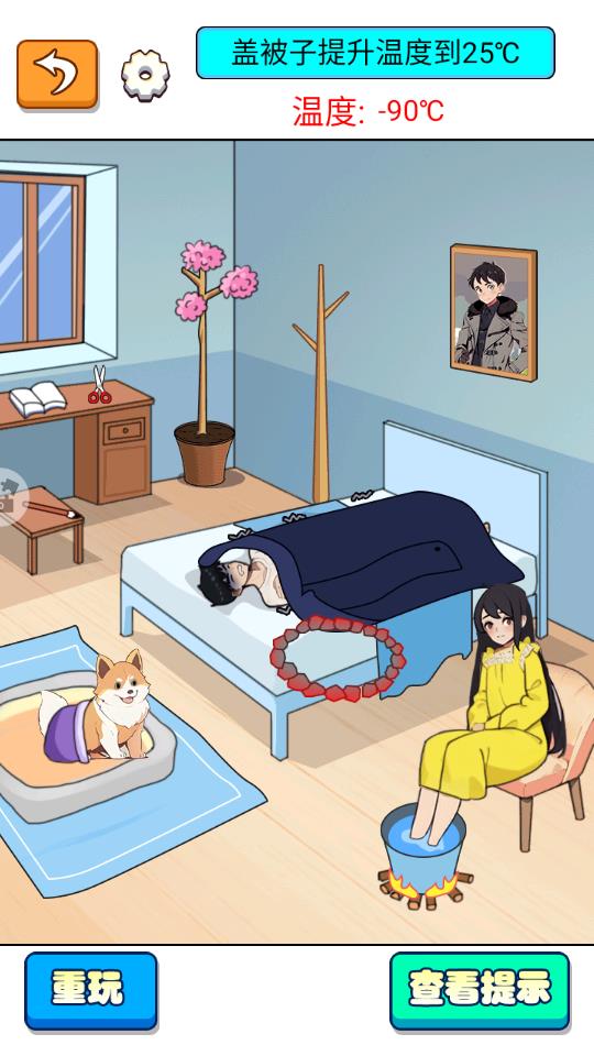 帮助关卡中的角色快速添加各种被子,将不同的服装拖动到角色身体就可以提升温度。