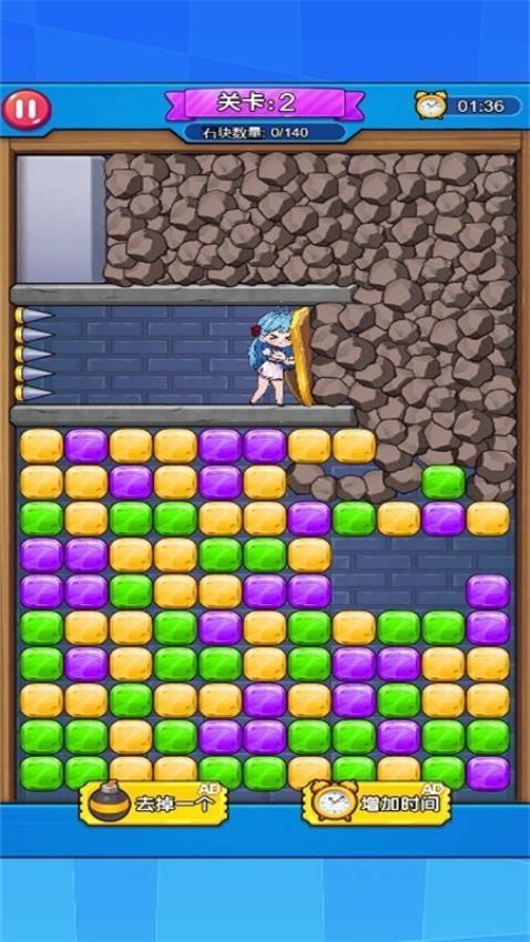 画面显示非常多的石头,石头会一直攻击角色,消除方块就可以让石头掉落下去,从而拯救角色。