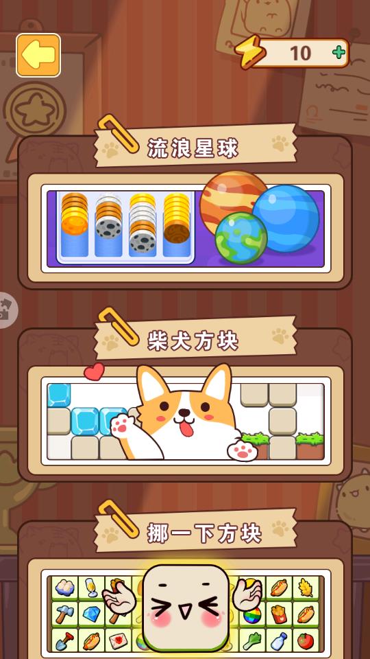 这脑洞泰裤辣手游华为版提供三种简单的游戏,支持流浪星球、柴犬方块、挪一下方块等游戏,直接进入游戏就可以随意点击一种游戏开始体验,例如点击流浪星球游戏,可以在游戏界面显示丰富的星球卡牌,您需要将混乱的卡牌分类,分类完毕就可以合成卡牌,玩法还是非常简单的,您也可以直接点击挪一下方块游戏,这种游戏是消消乐玩法,可以直接显示几十种物品,您需要将相同的物品消除,点击一个相同的物品就可以直接消除,也可以拖动物品到适合的位置消除,任何人都可以体验消消乐、连连看的玩法,需要的朋友就可以下载使用。