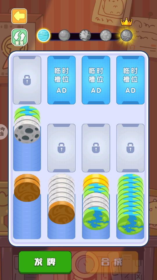 可以显示多个星球卡牌,将卡牌移动到相同的槽位就可以合成新的卡牌,自动消除已经合成的卡牌