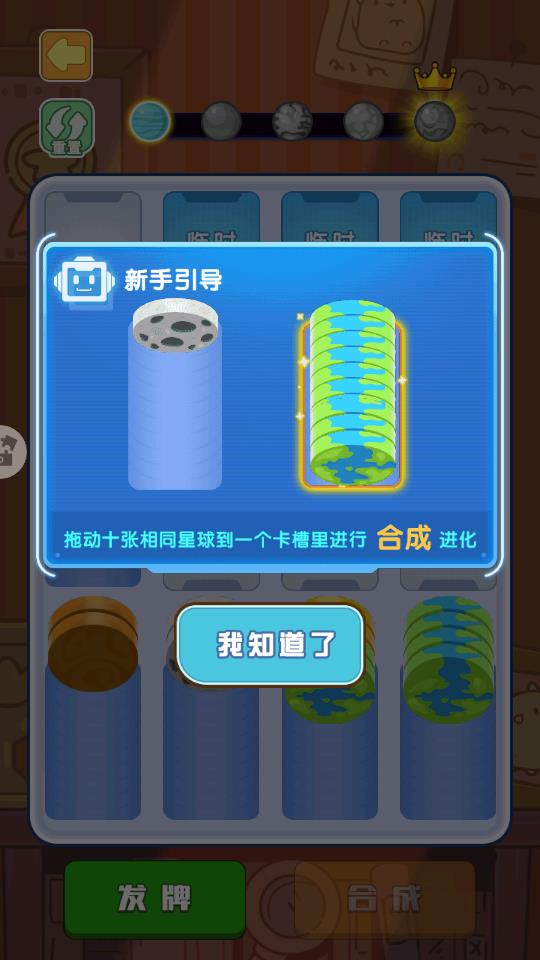 3、弹出新手引导的界面,拖动十张相同星球到一个卡槽里进行合成进化,点击我知道了