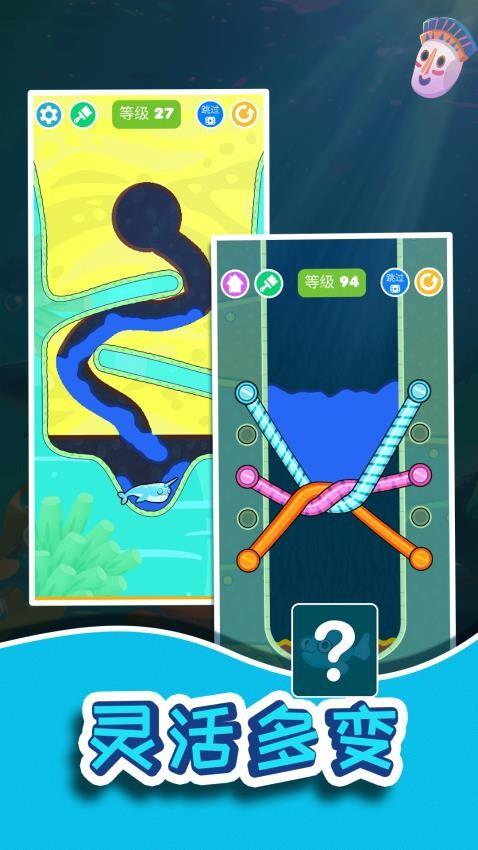 2、解开所有绳子即可让海水流到小鱼所在的位置,考验你的逻辑能力。