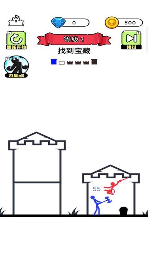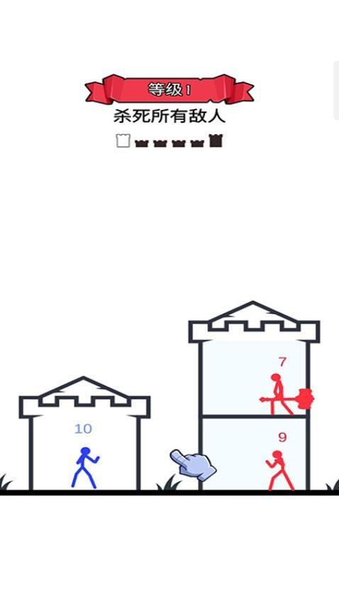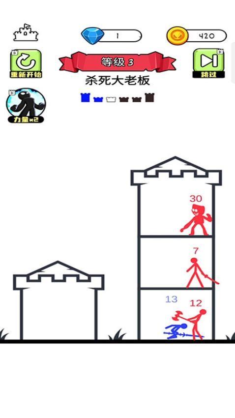 4、等级3里面出现了非常强大的BOSS,逐步操控火柴人应对每层楼中的敌人,提升能力以便对付BOSS。