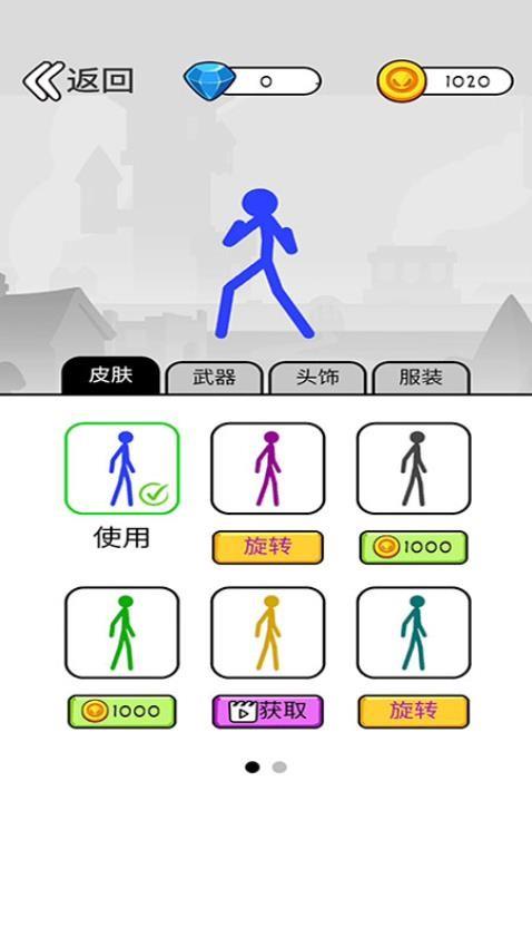 1、购买你所喜欢的火柴人皮肤,还可挑选武器、头饰、服装等等,即可进入到闯关过程中。