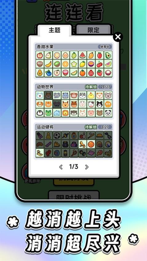 2、游戏内置多种主题皮肤,从鲜嫩水果、萌趣动物到奇幻海洋生物,解锁后即可切换视觉风格,清新画风搭配舒缓音效,营造轻松解压的氛围。
