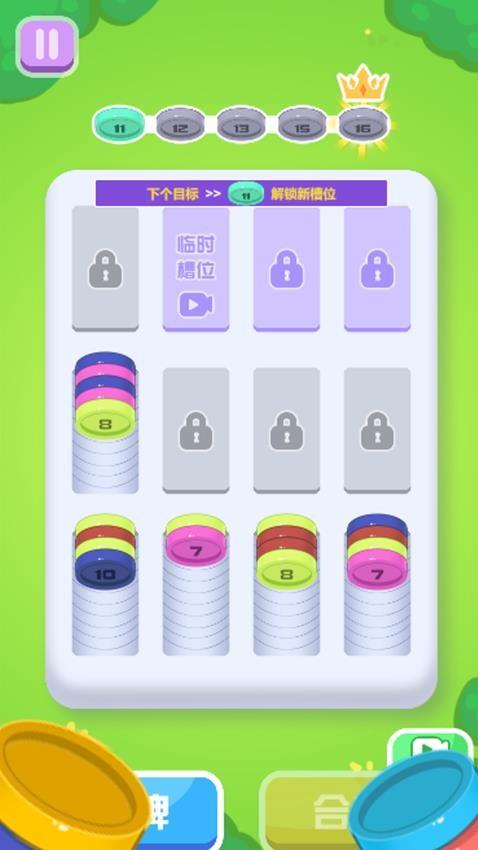 2、将这些颜色相同的硬币逐步移动到同一个卡槽中,这样才能达到合成目的,以便收获阶段性胜利。