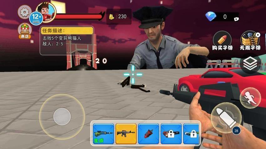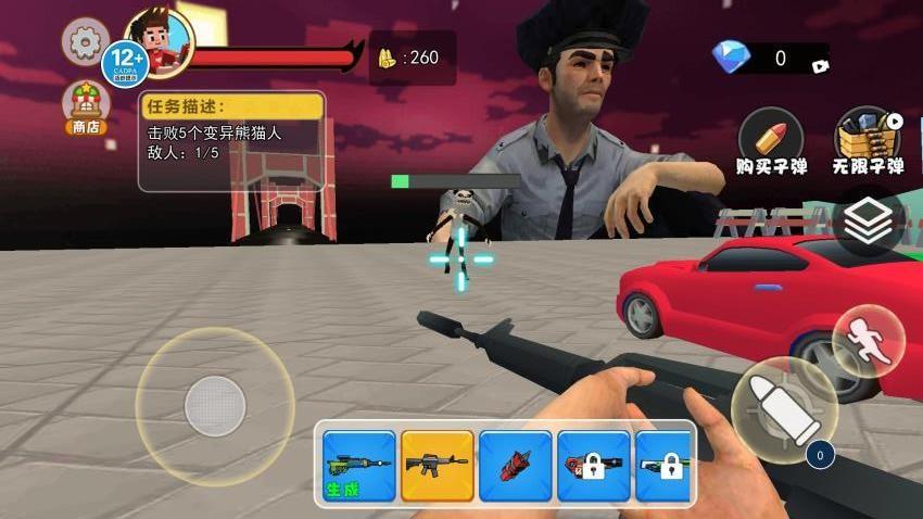 1、点击下方武器框之中的第一把枪之后,开始行动并寻找熊猫人,需关注任务目标。