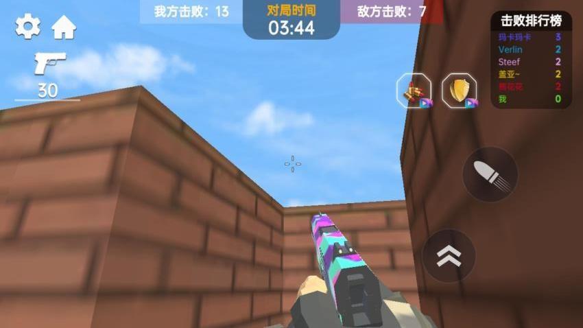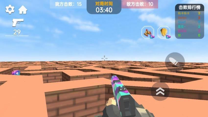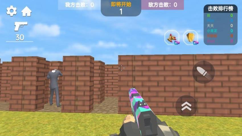 在游戏地图和其他角色相互攻击,可以切换不同的枪械射击,死亡还可以复活