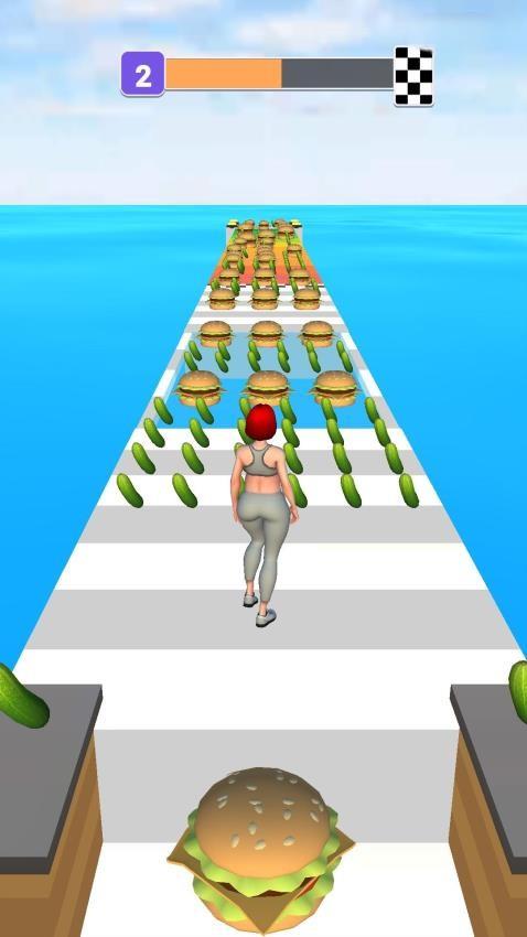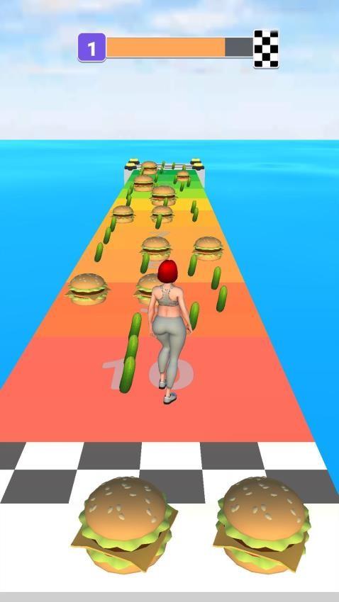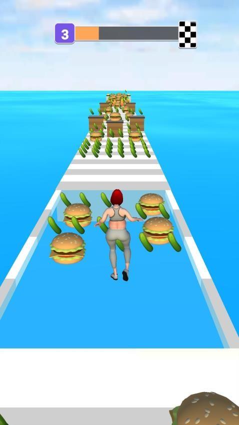 1、起点的倒计时结束之后立即奔跑,点击女子灵活移动绕过更多汉堡。