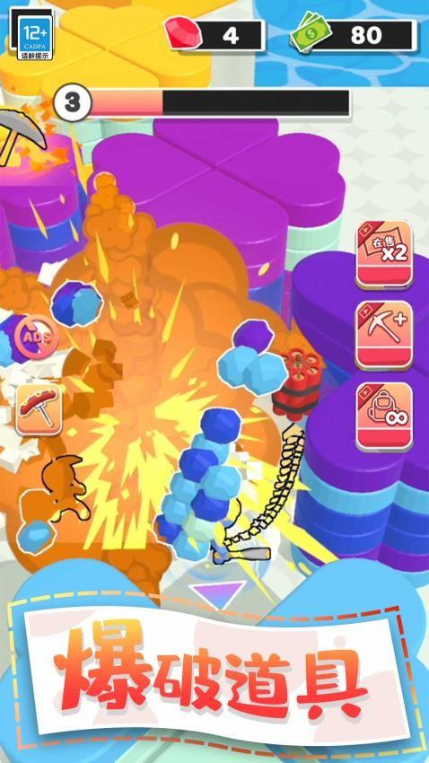 3、爆破道具点击利用,遇见复杂的障碍时可以使用道具进行爆破,可以直接摧毁所有岩壁和特殊障碍,非常轻松。