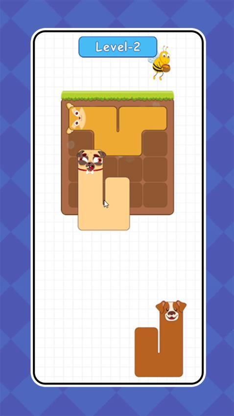 N边形拼图是一款以户外宠物为主题的益智游戏,玩家需要通过巧妙排列三只几何形状的萌犬方块来完成关卡挑战。在草坪地下的网格棋盘上,您需要将这些可爱的狗块围绕骨头、瓢虫等障碍物进行精准摆放,填满所有空白单元格即可通关。游戏采用清新可爱的美术风格,背景中的蜜蜂、灌木丛等元素营造出轻松愉快的氛围。