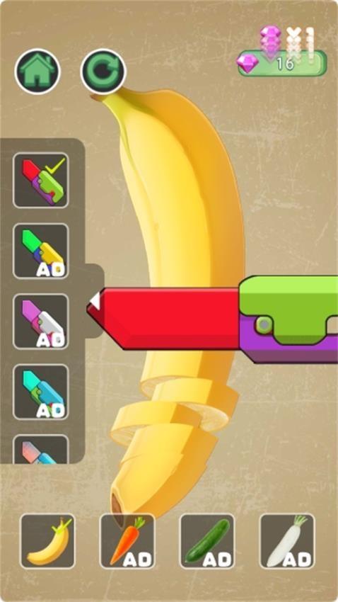 5、切水果的玩法,可以在游戏底部解锁香蕉、胡萝卜、黄瓜、白萝卜