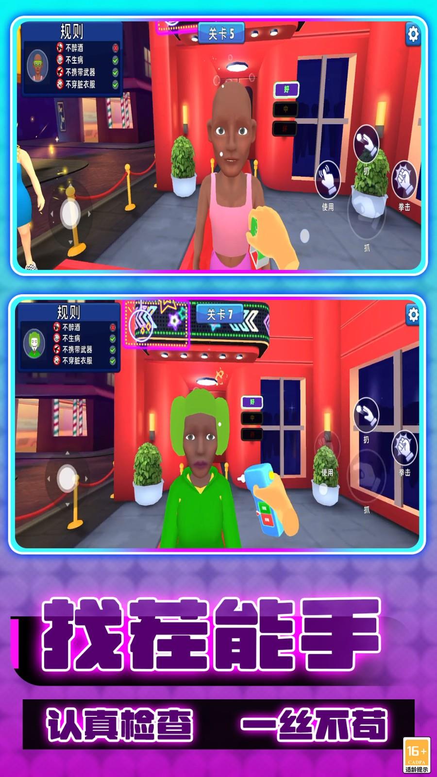 细节找茬王是一款非常好玩的休闲游戏。每个关卡中设计了主要的规则要求,你可直接查看界面上的信息,比如不喝酒、不生病等等,只要发现即将进入馆内的顾客有着相应的情况,需要阻拦他们进入,才能完成关卡的挑战目的。寻找观察的时候必须细心,耐心使用相关的仪器来检查,玩家还能很快关注相应的变化情况,以便得到一些提示。这些人物也会有掩藏行为出现,必须在适合的时候尽快发现,不会出现太多的问题。当你在关卡中遇到了非常棘手的状况时,可开启极为便捷的模式,继而可让自己轻松关注更为重要的人物。
