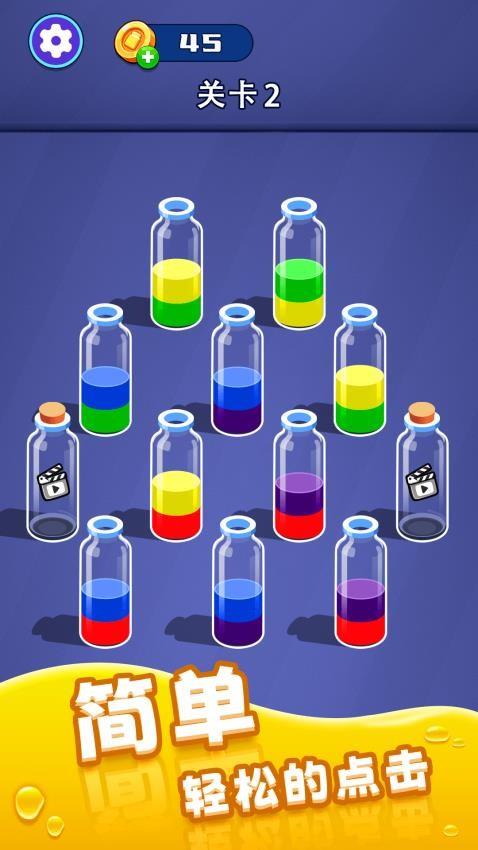 过快的生活节奏是不是让你压力很大?你想要解压吗?经典倒水游戏,搭配精美画面和炫酷特效,把不同颜色的水装进一个水瓶里,是不是觉得很简单,玩法虽然简单但是却不无聊,快来玩倒水消除你的烦恼,释放你的压力!