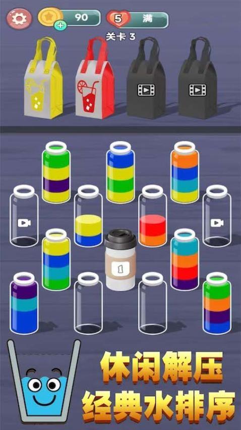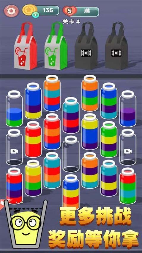 1、每个关卡中出现的液体颜色都不一样,需要玩家观察颜色并进行分类,细致分类组合才能满足相应的过关要求,不能有丝毫松懈。