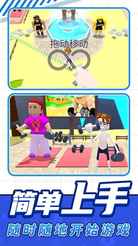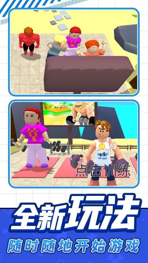 想体验从健身训练到竞技对战的成长乐趣吗?开启独特的力量提升之旅!在健身中心,点击训练轻松获取资源,升级设施与属性,见证角色从弱到强的蜕变。完成训练挑战,踏入对战舞台,与对手展开激烈竞技,用点击操作释放训练成果,感受胜利的畅快。无论是休闲锻炼还是竞技挑战,都能沉浸其中。