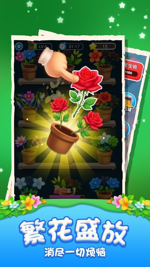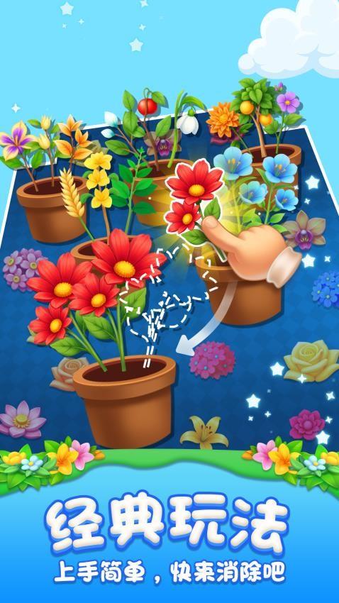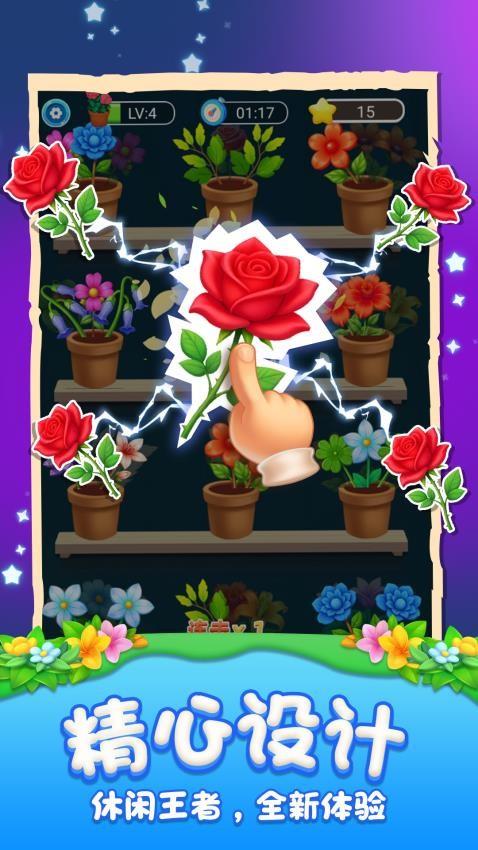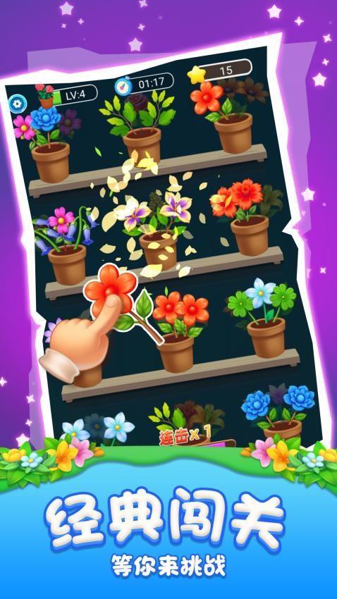 一款休闲益智类插花消除小游戏,画风简约,游戏中每个花盆里有3朵不一样的花朵,点击拖动花朵至3个一样的花朵到花盆中便可消除成功,在规定的时间内把所有花朵都消除完毕并可过关,开启新的关卡。