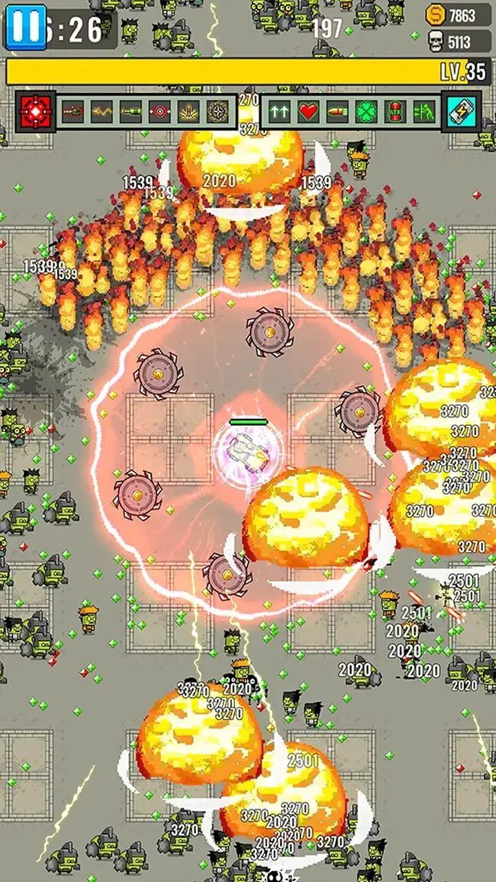 1.控制你的战车在场景内进行割草生存挑战,击败一定数量的僵尸可以对战车进行升级,获得随机的新能力。