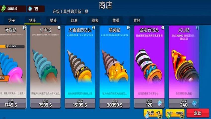 2、升级装备,效率倍增,通过出售挖掘到的资源,你可以解锁更高级的工具,比如电动钻头、爆破装备等,让挖掘速度大幅提升!