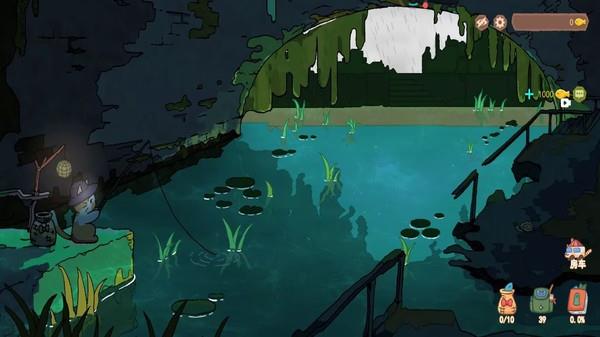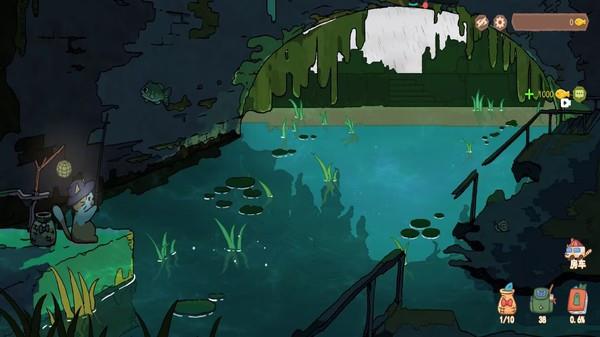3、跟随小猫的视角便可关注河里的情况,并且还可看到相应动静,确定之后便可将鱼竿举起来,获得全新鱼类。