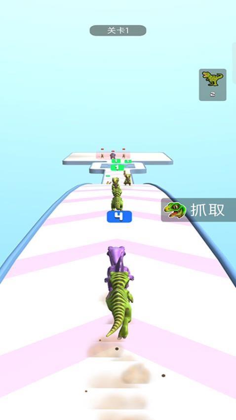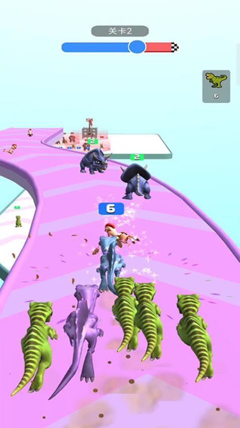这是一款跑酷游戏,玩家指尖移动恐龙,躲避跑道上的障碍,获取道具与小帮手,顺利到达战斗场,合成恐龙进行升级,获取更高战斗力,开启对战,赢得胜利!