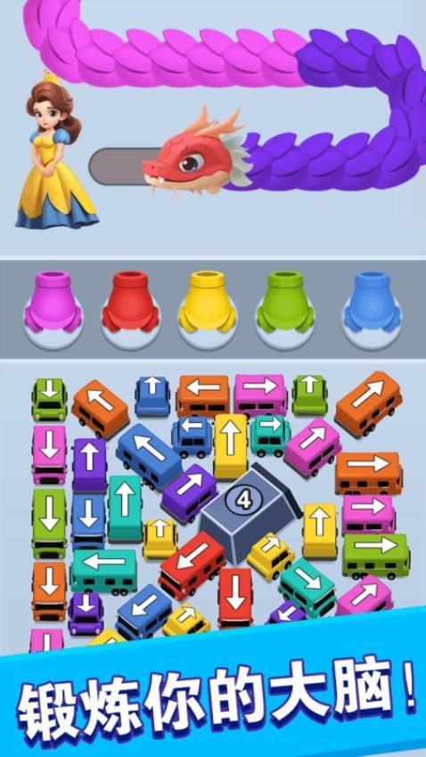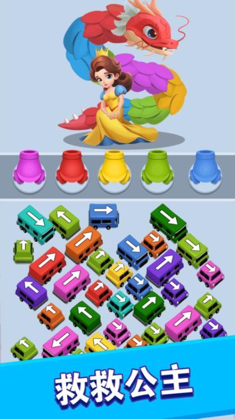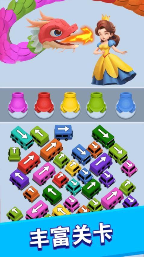 《消除无压力》是一款创意消除闯关游戏。画面中,多彩小车排列成阵,箭头指示行驶方向,玩家需通过消除同色、同方向小车,为公主开辟安全路径。关卡丰富,每一关都有独特布局,还有炸弹等道具助力。