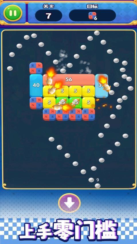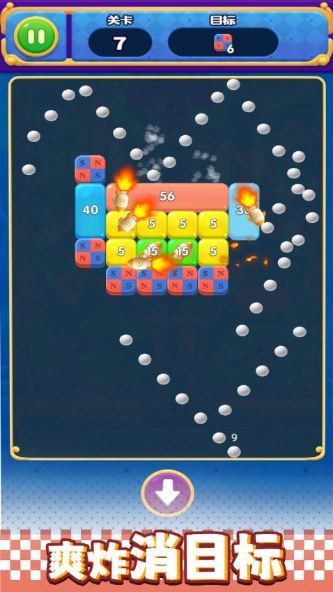 2、弹珠的弹射技巧学习,不断优化发射策略增加弹射次数与力度,这样才有可能击碎更多的方块获取分数。