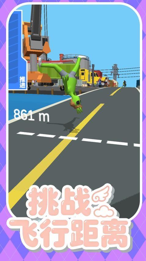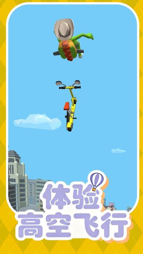玩家通过操控自行车进行跳跃、加速等动作,在各种场景中挑战。通过点击屏幕加速自行车,在坡道处再次点击可触发喷气背包飞行,飞得越远得分越高。