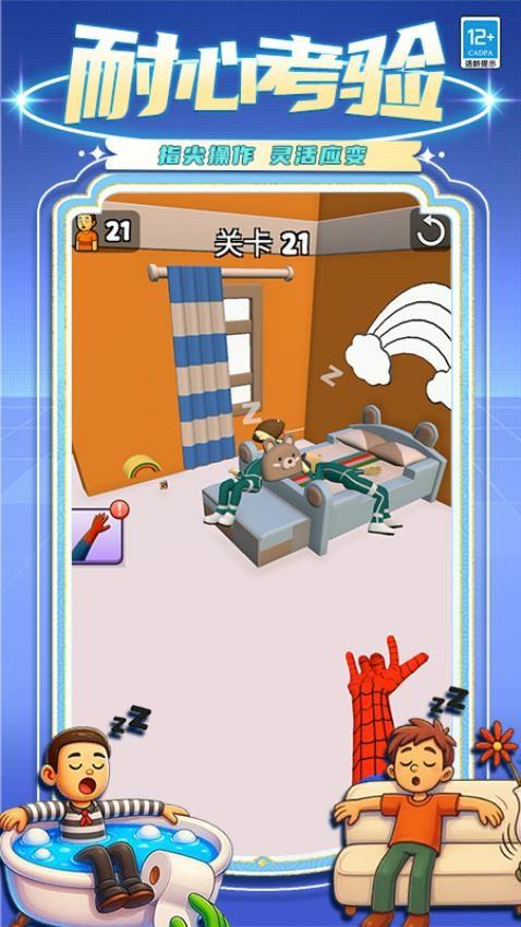 吗喽的命也是命是一款相当搞笑的休闲闯关游戏。在这里,你需要对房间内的所有人使用入睡技能,这样便可让这些人尽快睡觉,这样便可让这些吗喽尽快逃脱出去;此外,你还可给人类设计适合的睡姿,进而可获得好处。行动的时候玩家需避开人类的视线,这样就不会被发现,同时还要关注他们的精力能量,及时消耗才能让他们更快入睡,完成你的挑战目标。可以使用蜘蛛侠套装来体验这个游戏,而且蜘蛛侠的技能也会在关卡中得到展现,需及时发现特殊的作用变化,帮助吗喽逃跑。如果你也对这款游戏感兴趣的话,不妨来试玩一下吧!