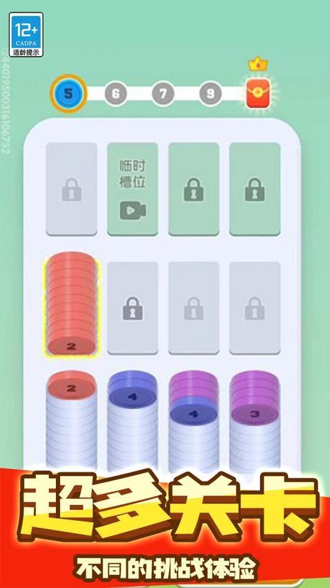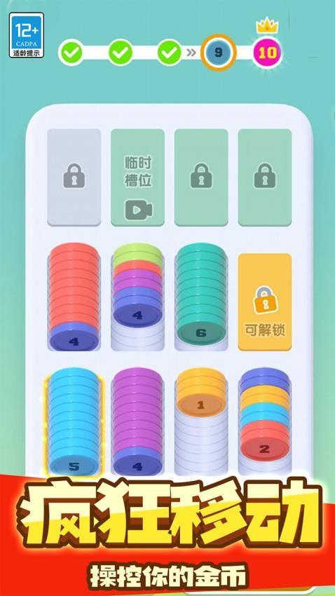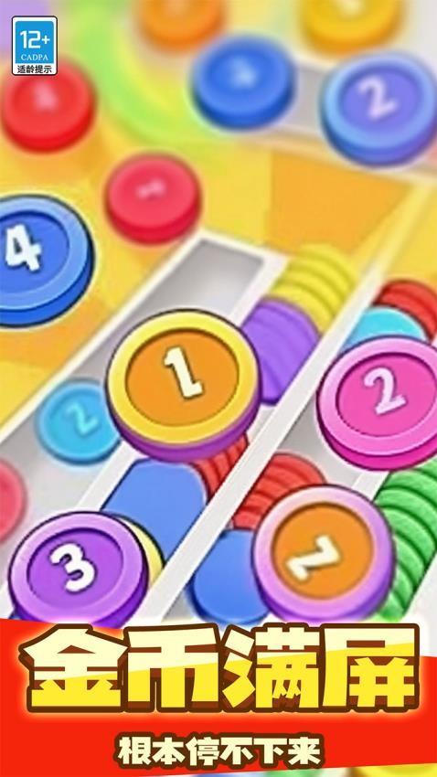 这是一款玩法新颖、趣味解压的游戏。游戏中,你会看到色彩斑斓的硬币整齐排列在槽位中,部分槽位带有问号,充满神秘感。你需要通过疯狂移动硬币,让相同数字的硬币归类到同一槽位。游戏过程中,金币满屏,操作根本停不下来。随着关卡推进,可解锁更多槽位,挑战不同体验的关卡。