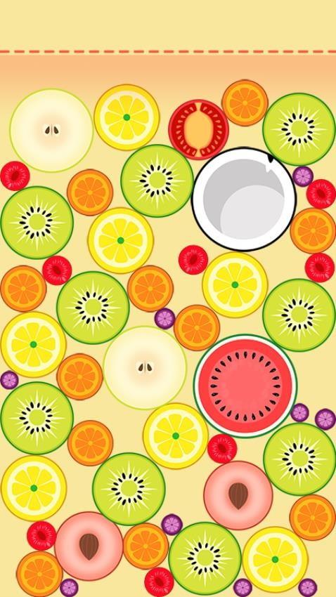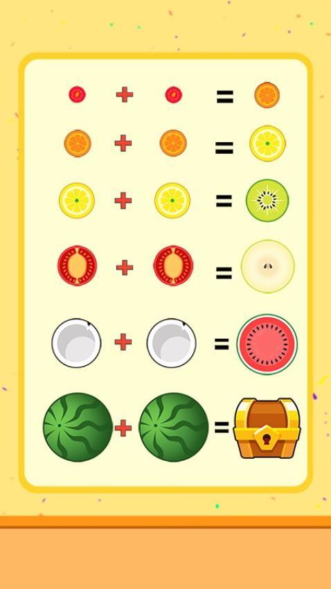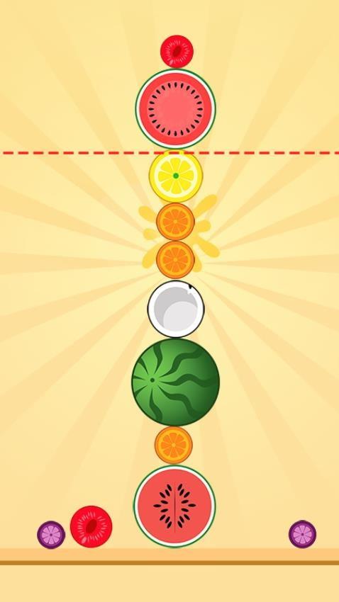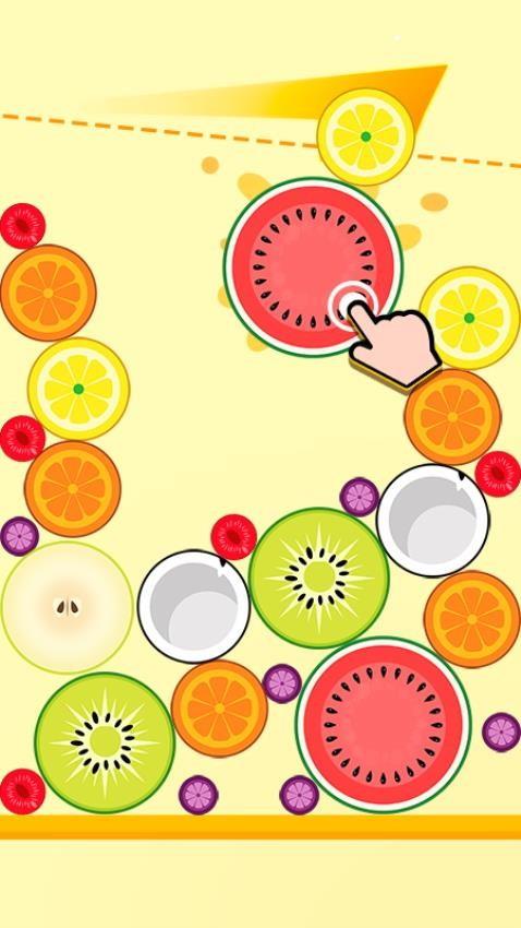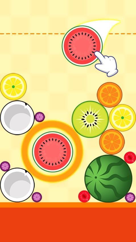 1、游戏趣味十足,合成的玩法与2048有些类似,简单滑动和按压屏幕就能完成关卡挑战,注意水果下落的位置即可实现合成消除。