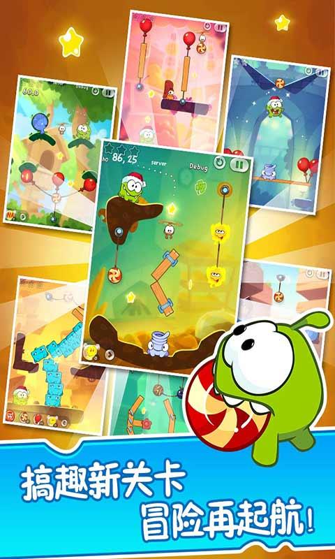 割绳子2最新版下载是款不错的休闲类游戏,画面基本保留了前作的卡通清新风格,在游戏中OmNom新结识的五位各具神通的超萌小伙伴将会帮助你度过重重难关,充分利用割绳子2中它们的能力,完成小吃货的糖果梦吧!除了传统的收集星星,通过搜集割绳子2下载中的四叶草将会开启隐藏关卡。游戏操作还是采用触屏控制,只需你轻轻划断绳子,控制好一些道具或小伙伴的使用时机即可,喜欢的玩家不要错过哟。