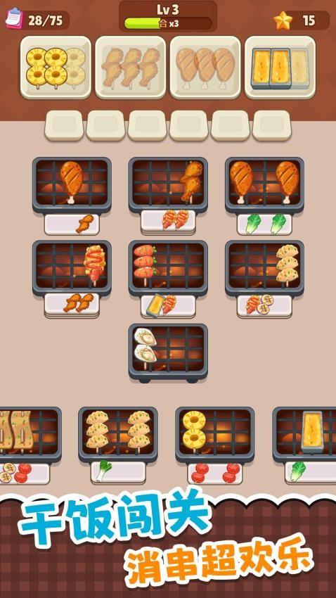 是一款串烧主题消除游戏。通过点击相同食材完成关卡,从基础匹配到食材搭配烤制,玩法丰富。画面呈现多样烤物,如肉串、蔬菜、海鲜等,不同关卡有特色目标,还含辅助道具。操作简单,休闲解压,带你体验烤串消除的乐趣,适合放松玩乐