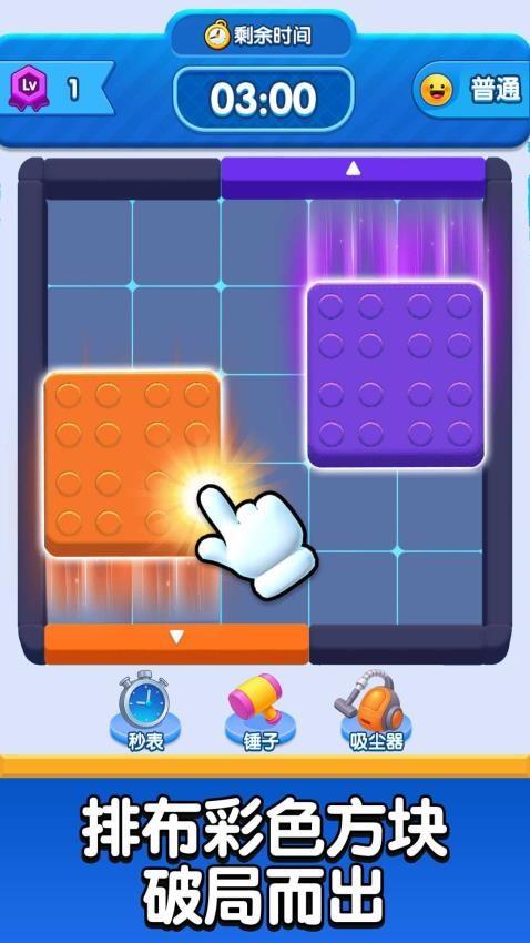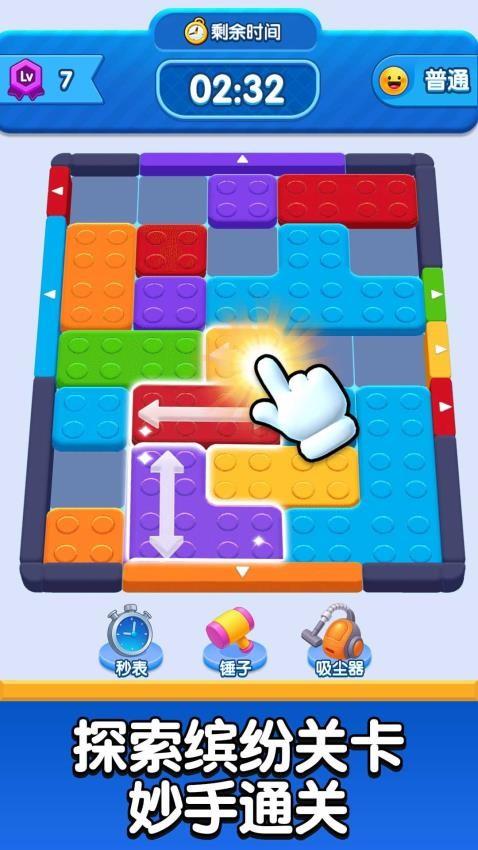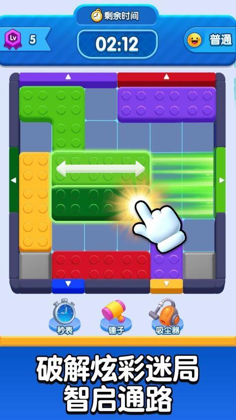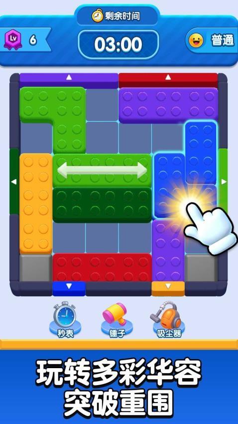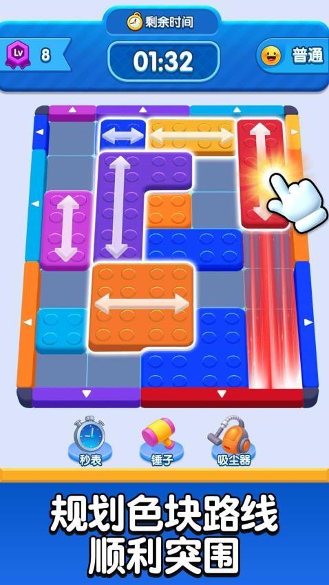 这是一款彩色方块华容道类益智游戏,核心玩法是在限定时间内,通过滑动不同颜色和形状的方块,为目标方块规划出一条通往出口的路径,将其移出棋盘即可通关。游戏还提供秒表、锤子、吸尘器等道具辅助破局,关卡难度会随等级提升而逐步增加。