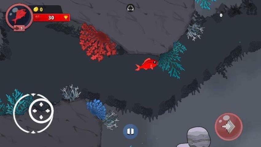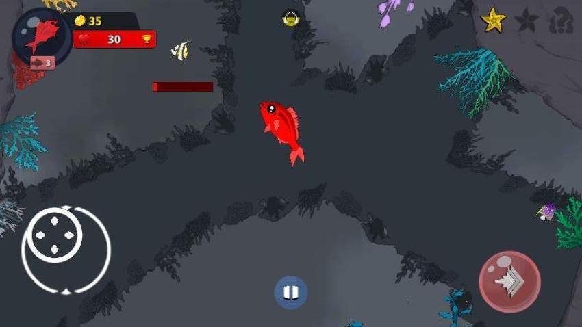1、点击屏幕左侧轮盘,控制你的小鱼在海底中游动,进食小鱼进行成长。