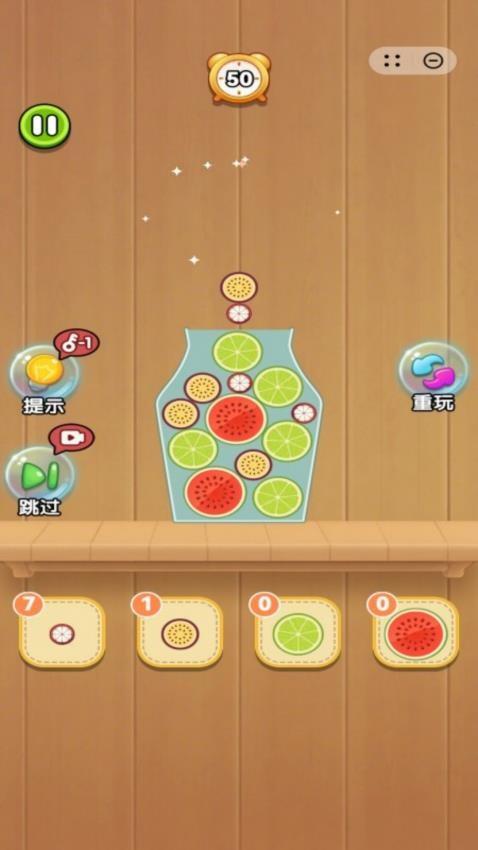 《水果请加满》是一款以水果搭配为主题的休闲益智游戏。玩家需要将各种水果切片放入杯中,通过策略性地选择和放置来完成关卡目标。每个关卡都设计有特定的挑战,考验你的逻辑思维和空间规划能力。这是一款考验你观察力和策略安排能力的小游戏。快来试试这款小游戏,享受水果搭配的乐趣!