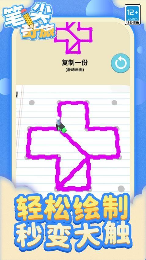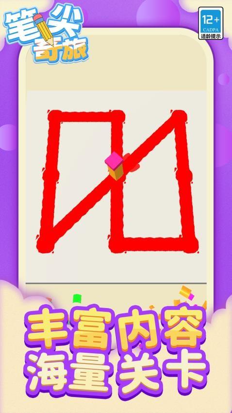 《笔尖奇旅》是一款休闲益智的画线涂鸦游戏,玩家需要根据给出的图案,一笔完成涂鸦绘画,快发挥你们的聪明才智,完成一笔涂鸦挑战吧!