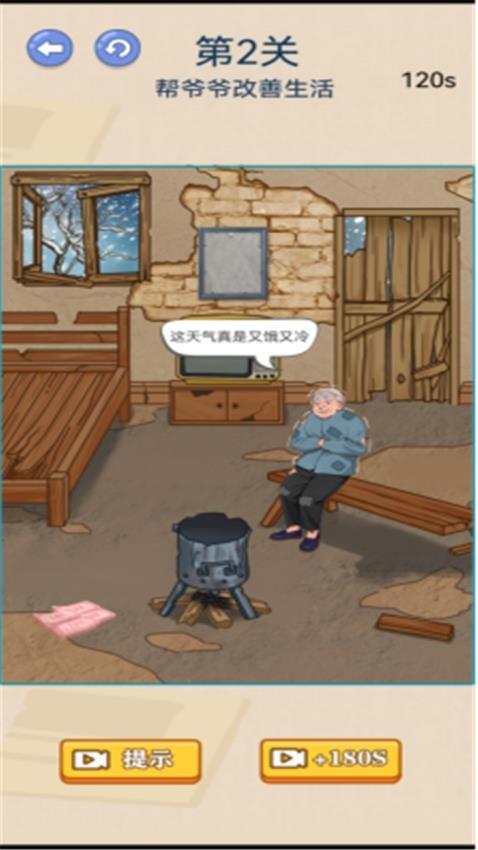 2、帮爷爷过上好日子游戏,您需要在游戏界面帮助角色改善房屋场景。