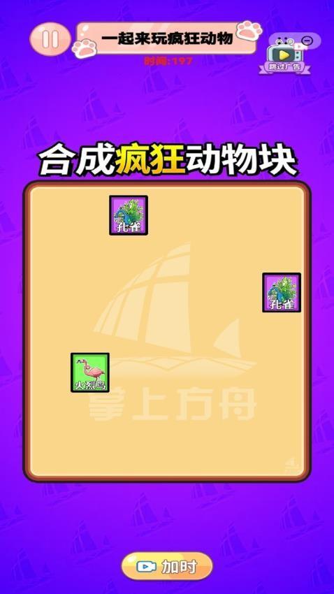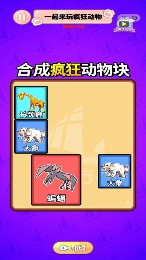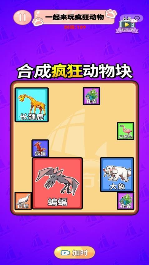 《快乐消方块》是一款趣味动物合成游戏,你需在限时挑战中,将长颈鹿、蝙蝠、孔雀等相同动物方块合成。过程中可借助加时、跳过广告功能助力,成功合成后能解锁新物种,通关还可开启下一关,开启一场充满策略与惊喜的动物合成冒险。